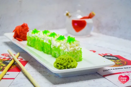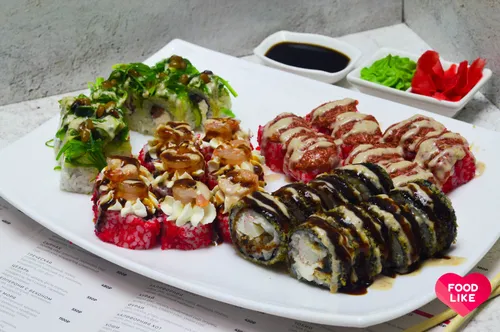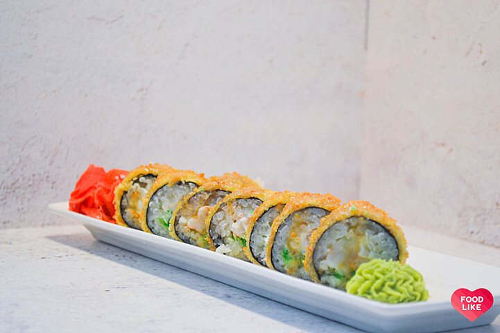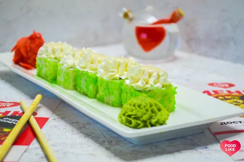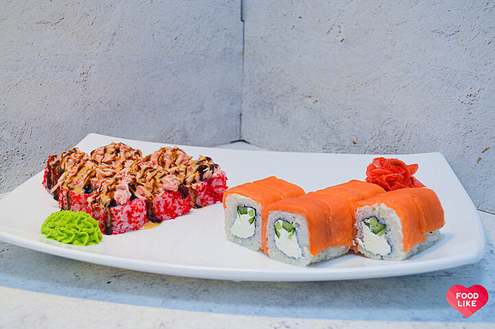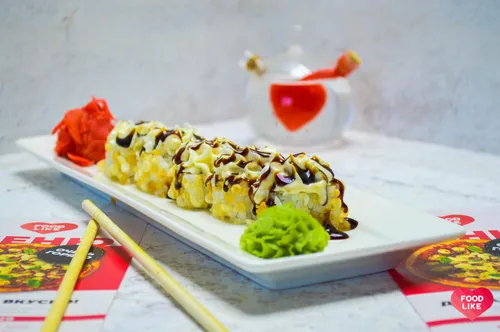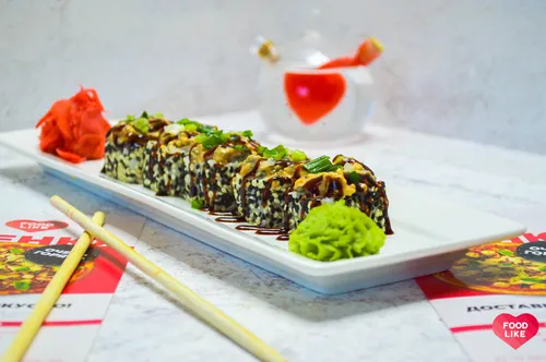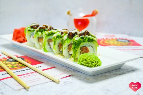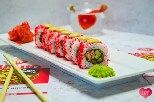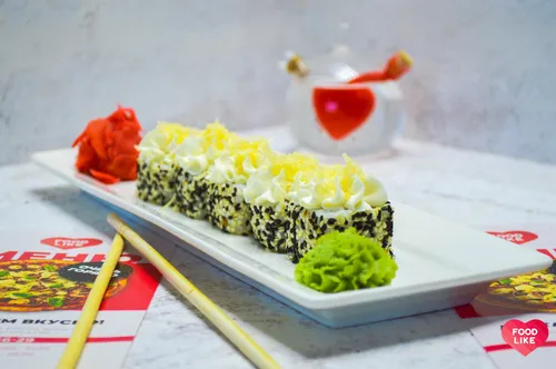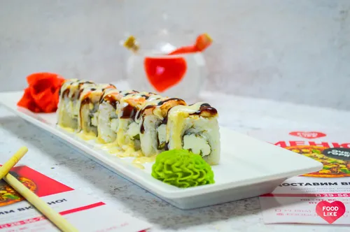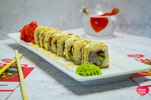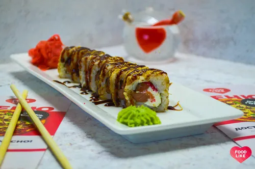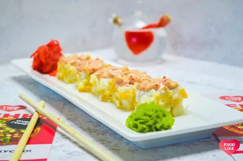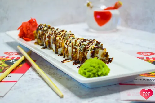 Якудза - Рис, нори, творожный сыр, тобико, крабовая палочка, спайси соус, ореховый соус.