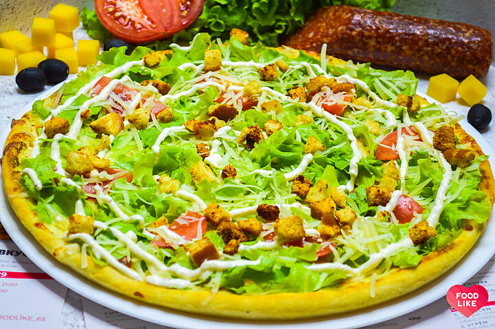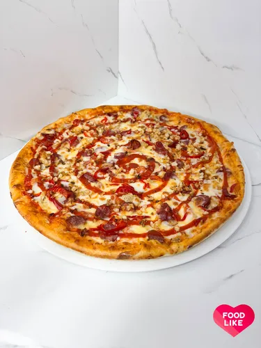 Основа, соус "ТарТар", острый соус, фарш домашний, помидоры, охотничьи колбаски, перец чили, лук (фри), сыр "Моцарелла".