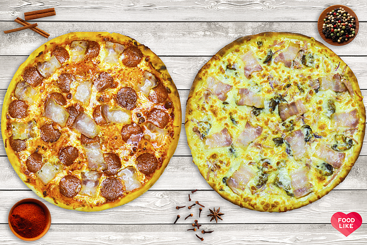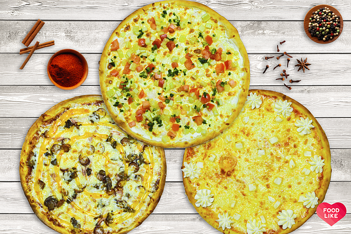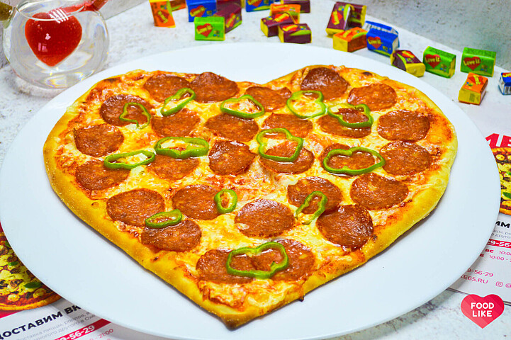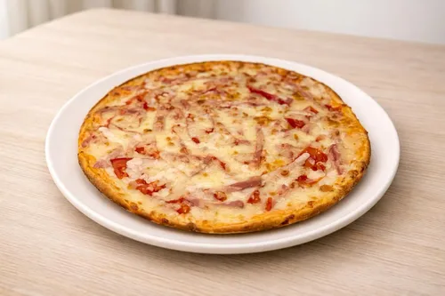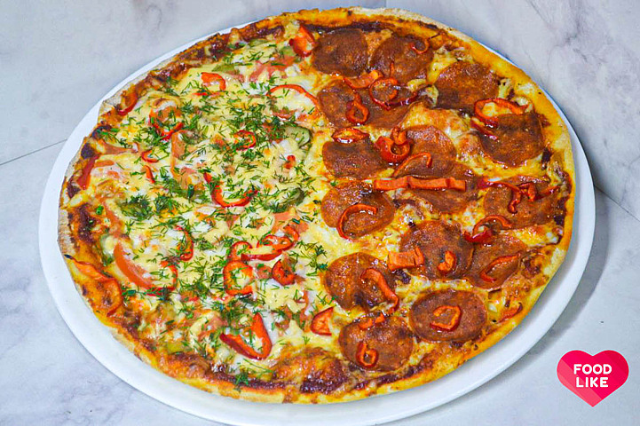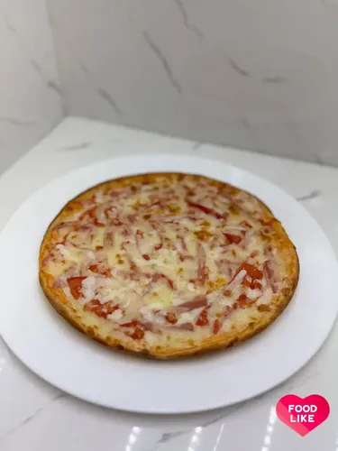 Основа, томатный соус, молочная колбаса, помидоры, сыр "Моцарелла".