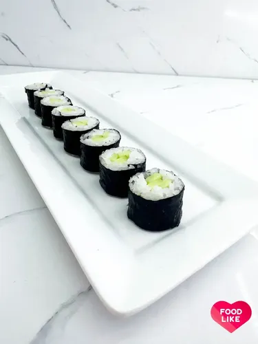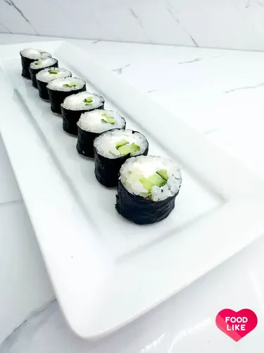 Рис, нори, огурец, творожный сыр, соевый соус, палочки для еды.
