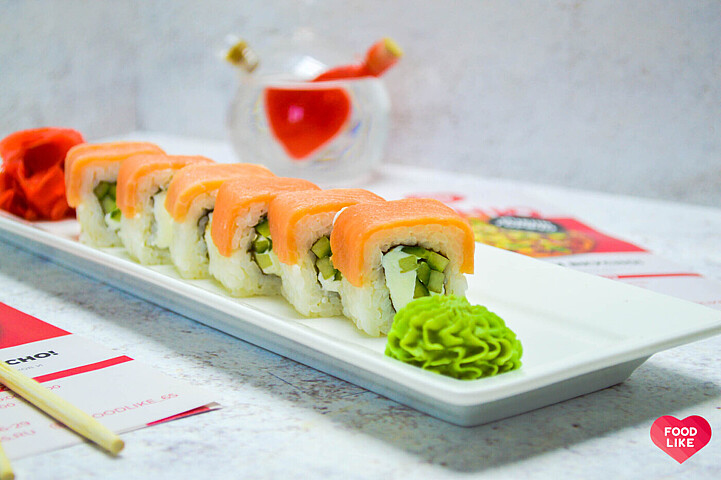 Рис, нори, авокадо, лосось, тобико, творожный сыр, ореховый соус, имбирь, васаби, соевый соус, палочки для еды.