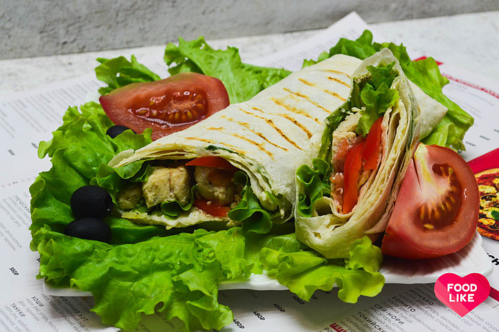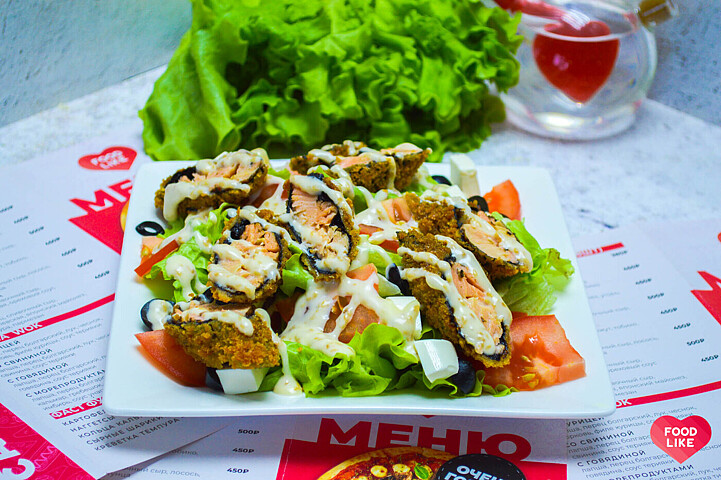 Аригато - Рис, нори, салат "Чука", творожный сыр, лосось, соус с кедровыми орешками, ореховый соус.