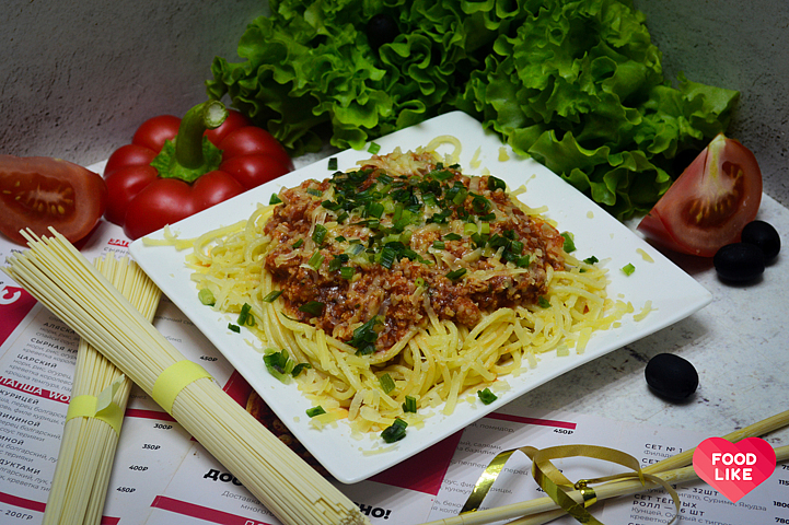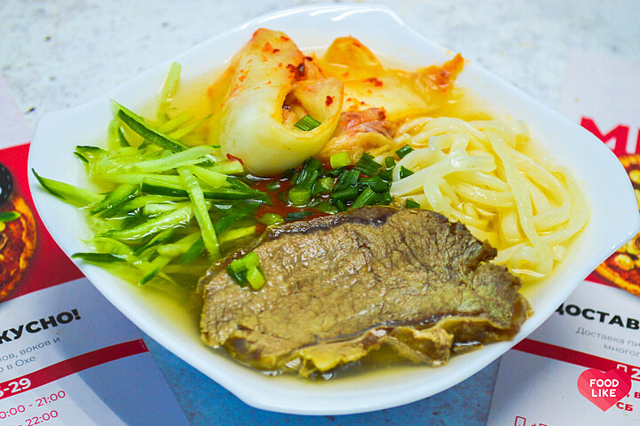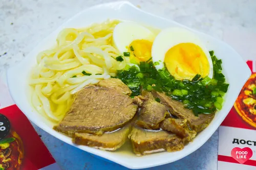 Лапша, говядина, яйцо, зеленый лук, говяжий бульон.