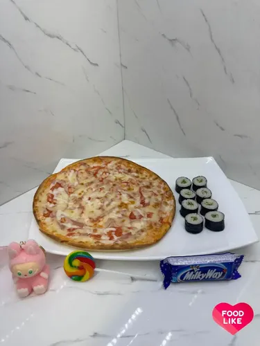 Детская пицца, детский ролл с огурцом и сыром, брелок-игрушка, леденец на палочке, MilkyWay (26 гр).