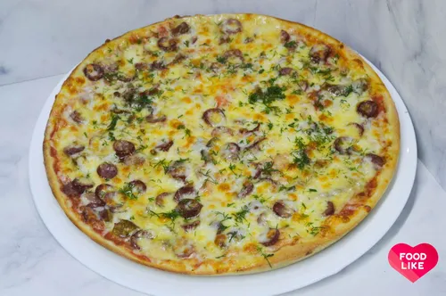 Основа, томатный соус, опята маринованные, охотничьи колбаски, укроп свежий, сыр "Пармезан", сыр "Моцарелла".