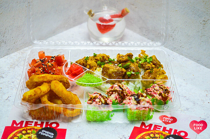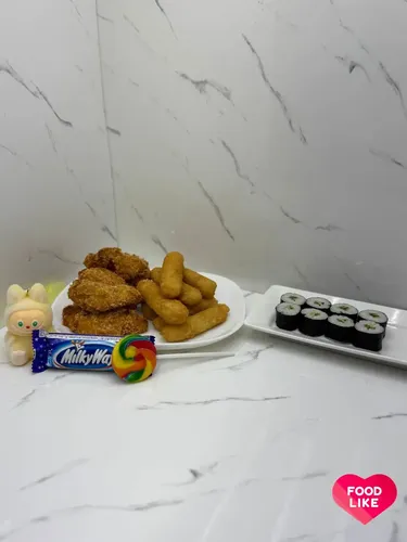 Наггетсы, сырные палочки, детский ролл с сыром и огурцом, брелок-игрушка, леденец на палочке, MilkyWay (26 гр).