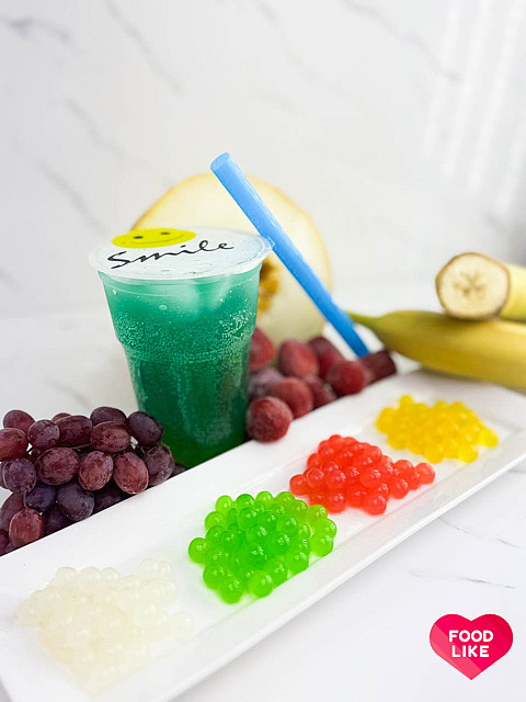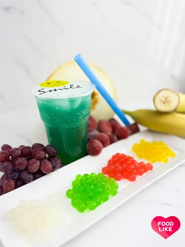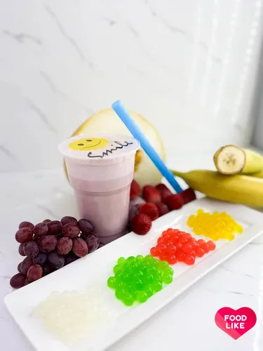 Молоко, банан, сироп "Виноград", джус-боллы, лед.