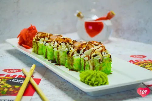 Рис, нори, авокадо, тигровая креветка, творожный сыр, унаги соус, ореховый соус, имбирь, васаби, соевый соус, палочки для еды.