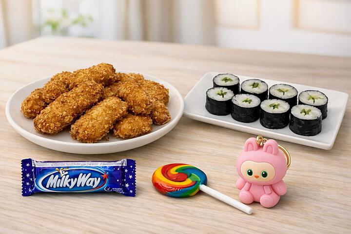 Наггетсы, детский ролл с огурцом и сыром, брелок-игрушка, леденец на палочке, MilkyWay (26 гр).