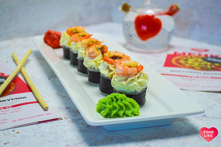Рис, нори, авокадо, тигровая креветка, творожный сыр, унаги соус, ореховый соус, имбирь, васаби, соевый соус, палочки для еды.