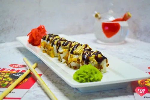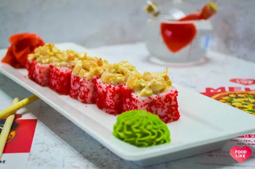 Рис, нори, творожный сыр, крабовая палочка, крошка темпура, гребешок, спайси соус, тобико, имбирь, васаби, соевый соус, палочки для еды.