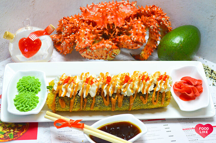 Рис, нори, крабовая палочка, авокадо, огурец, тобико, японский майонез, имбирь, васаби, соевый соус, палочки для еды.