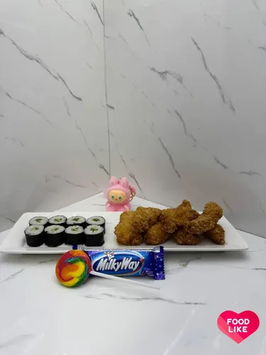 Наггетсы, сырные палочки, детский ролл с сыром и огурцом, брелок-игрушка, леденец на палочке, MilkyWay (26 гр).