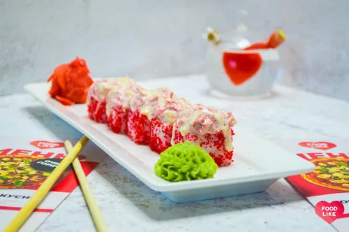Рис, нори, авокадо, лосось, тобико, творожный сыр, ореховый соус, имбирь, васаби, соевый соус, палочки для еды.